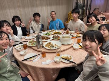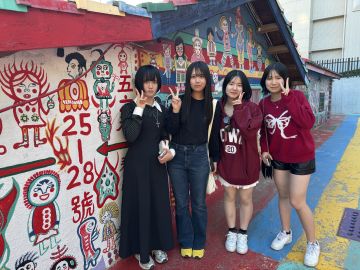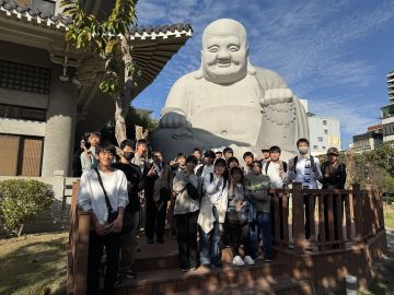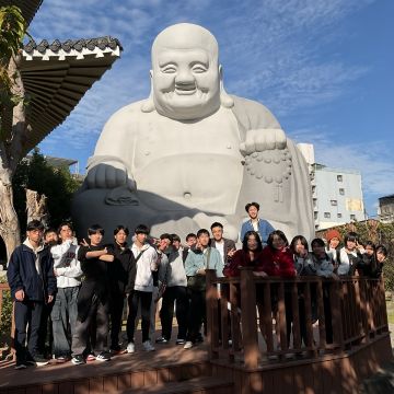 午後は、台中市まで旅を進めました。台北よりもさらに低緯度であるこの地域は12月でも暑く感じるくらいの気温でした。台中市では宝覚禅寺と彩虹眷村を訪れました。 宝覚禅寺には大きな布袋様の像があり驚きましたが、日本人の慰霊墓地や旧日本軍として出兵された台湾の方々の慰霊碑があるなど、私たち日本人にゆかりのあるものが多くありました。また、 彩虹眷村では黄永阜氏の描いた鮮やかな住居を見て楽しみました。その後、台湾の新幹線として有名な台湾高速鉄道で台北まで戻りました。3日目が終わりましたが全員元気で旅程を進めております。